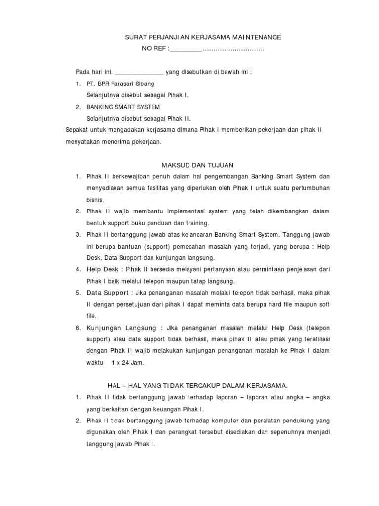 Contoh surat perjanjian kerjasama rumah makin / cafe. Kontrak atau perjanjian kerja adalah kesepakatan dalam bentuk tertulis atau lisan yang dibuat untuk mengikat hubungan antara pekerja atau buruh dengan pengusaha, dalam periode waktu tertentu. Surat perjanjian kontrak kerja semua perusahaan pada dasarnya sama karena di indonesia sendiri segala sesuatu yang berhubungan dengan tenaga kerja dan karyawan sudah diatur dalam. Kontrak kerja sangat penting kedudukannya. Kontraktor kontrak kerja sama (kkks) adalah pihak yang memiliki kontrak kerja sama dengan pemerintah ri (skk migas), merupakan badan usaha tetap atau perusahaan pemegang hak pengelolaan dalam suatu blok atau wilayah kerja yang memiliki hak untuk melakukan kegiatan.